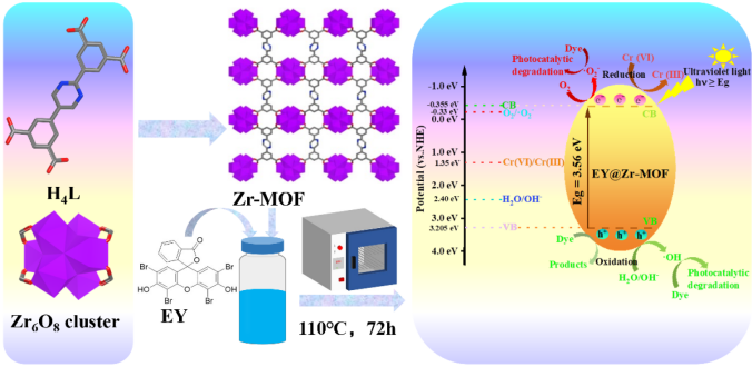 在印染废水深度处理方面,课题组构建了全新Zr-MOF及EY@Zr-MOF,实现了对水中Cr(VI)及多种活性染料的高效物理捕获与光化学降解。该材料对Cr(VI)的光还原效率高,对RB13、RR2和RR11的降解效果显著,反应动力学较Zr-MOF明显提升。研究成果以“Assembly of Eosin Y in-situ intercalated Zr-MOF composite for decontaminating Cr(VI) and reactive dyes via physical capture and photochemical purification”为题发表于《Journal of Molecular Structure》(中科院SCI二区)。化学工程与技术2022级研究生秦颖彤为论文第一作者,李庆和朱炜老师为通讯作者,色情视频 为唯一通讯单位。