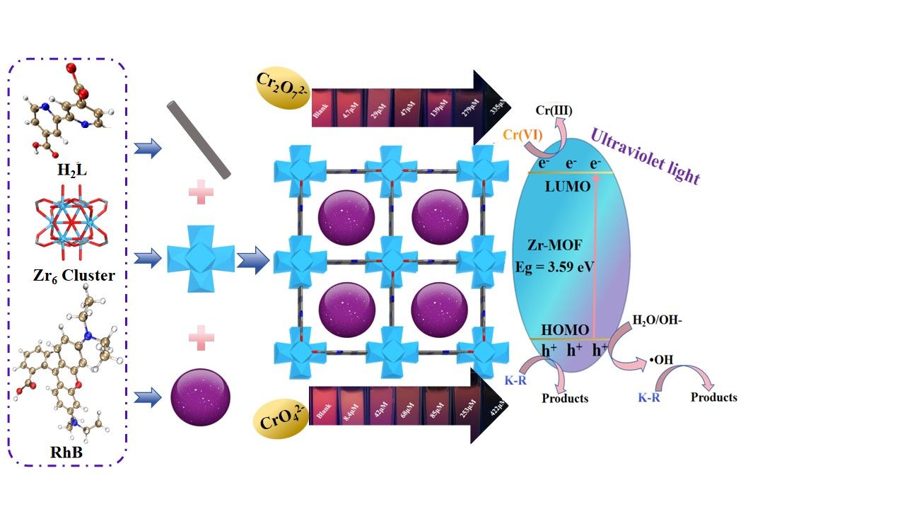 在荧光传感材料设计方面,课题组构建了新型双发射比率型荧光探针RhB@Zr-MOF,实现对Cr(VI)的高灵敏、高选择性检测。RhB分子有效抑制了聚集诱导猝灭,DFT计算证实材料荧光源于RhB分子的光致电子转移过程。此外,该材料还兼具对Cr(VI)的光还原及对活性染料的光催化降解能力。研究成果以“RhB intercalated Zr(VI)-bipyridine architecture for efficient ratiometric fluorescent response toward Cr(VI) analyte and decontamination of Cr(VI) and reactive dye via photochemical REDOX”为题发表于国际期刊《Journal of Molecular Structure》(中科院SCI二区)。化学工程与技术专业2022级研究生刘洁为论文第一作者,李庆和朱炜老师为通讯作者,色情视频 为唯一通讯单位。