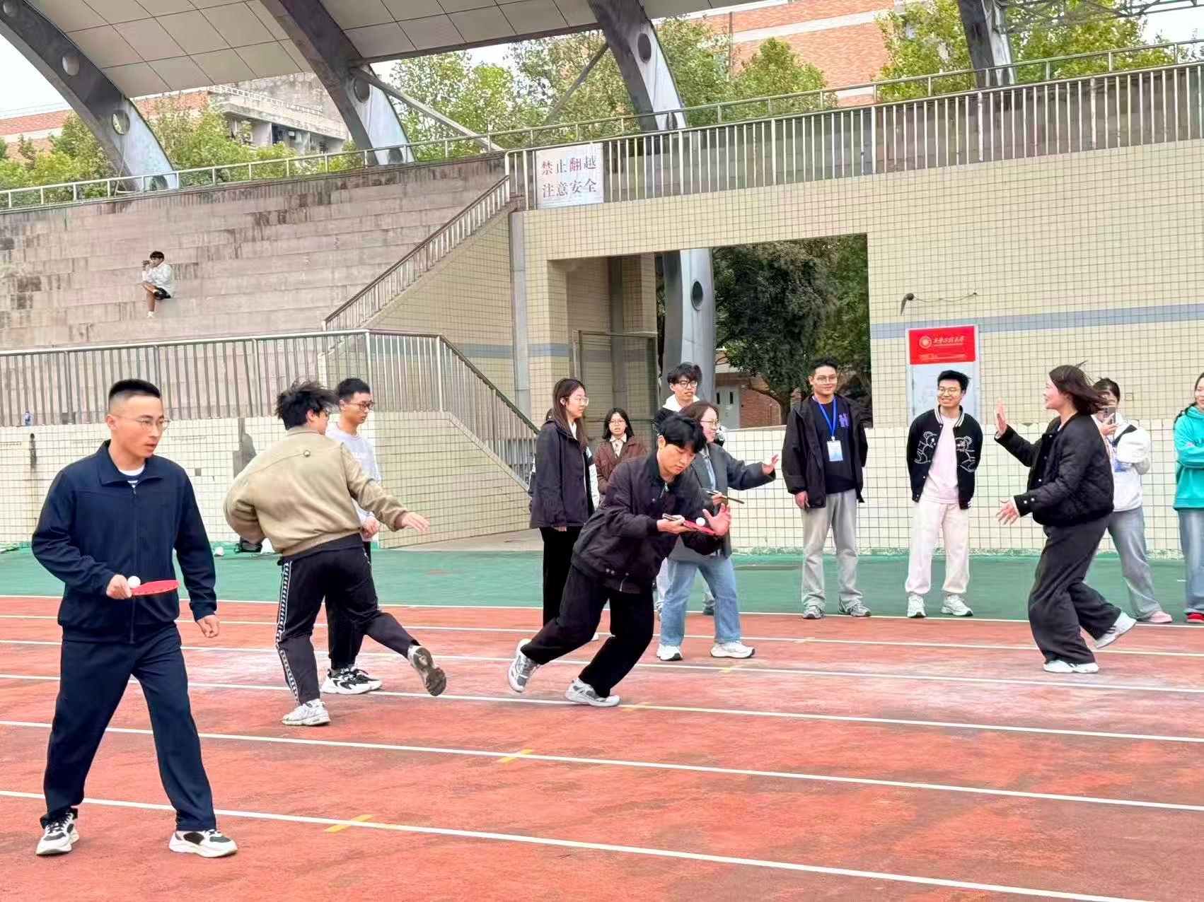 现场设置了“五毛一块”“海盗船长”“蒙眼侠客障碍赛”“极速三子棋”“趣味接力赛”“三人首字母表演”“穿过呼啦圈”七个项目,既考验参赛者的身体协调能力,也通过节奏配合增强了团队凝聚力,充分展现了同学们的创意与默契。体育场上欢声笑语不断,气氛热烈活跃。赛程间隙,研究生们还自发带来即兴表演,轻快的合唱将赛场瞬间转变为“青春舞台”,不仅缓解了比赛的紧张感,也进一步拉近了彼此的距离。