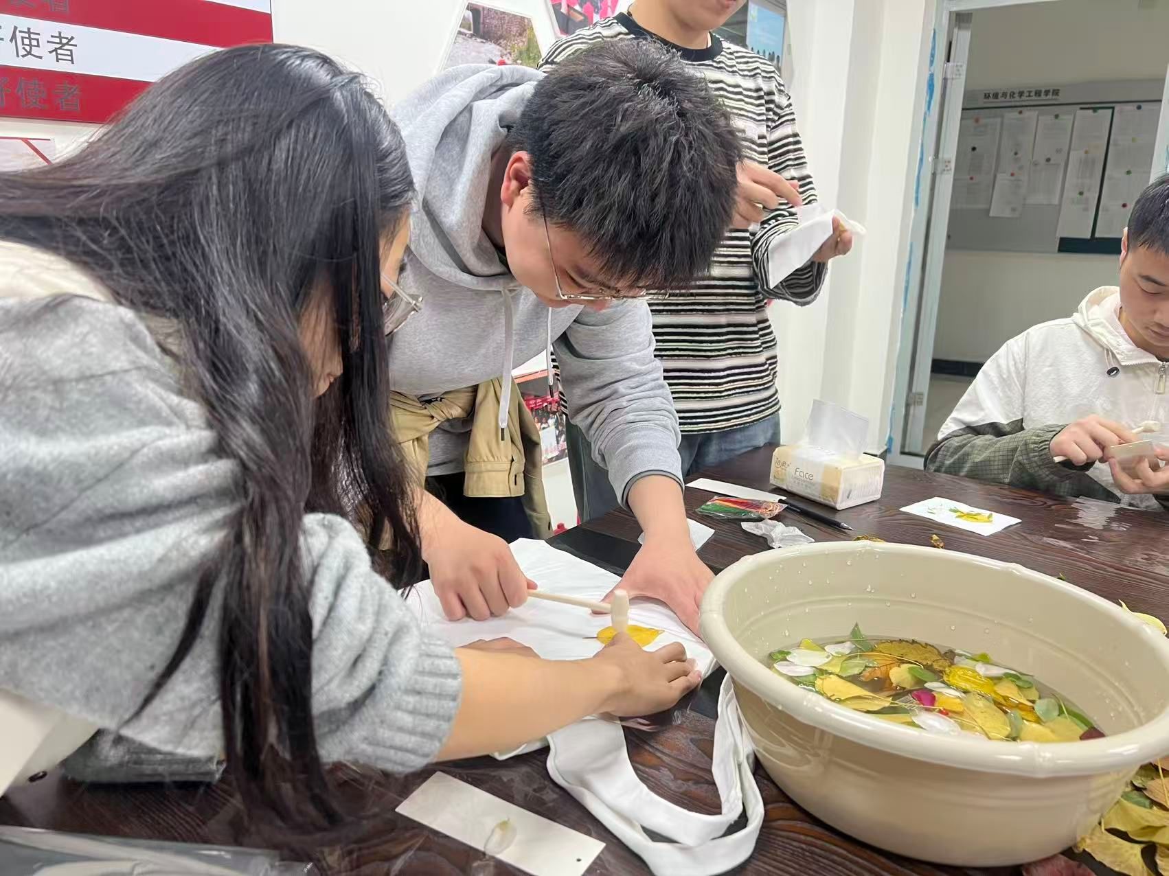 “化蝶”手工坊在“一站式”学生社区举办“落叶印象,重塑新生”植物拓印活动。本次活动吸引了二十几位学生踊跃参与。