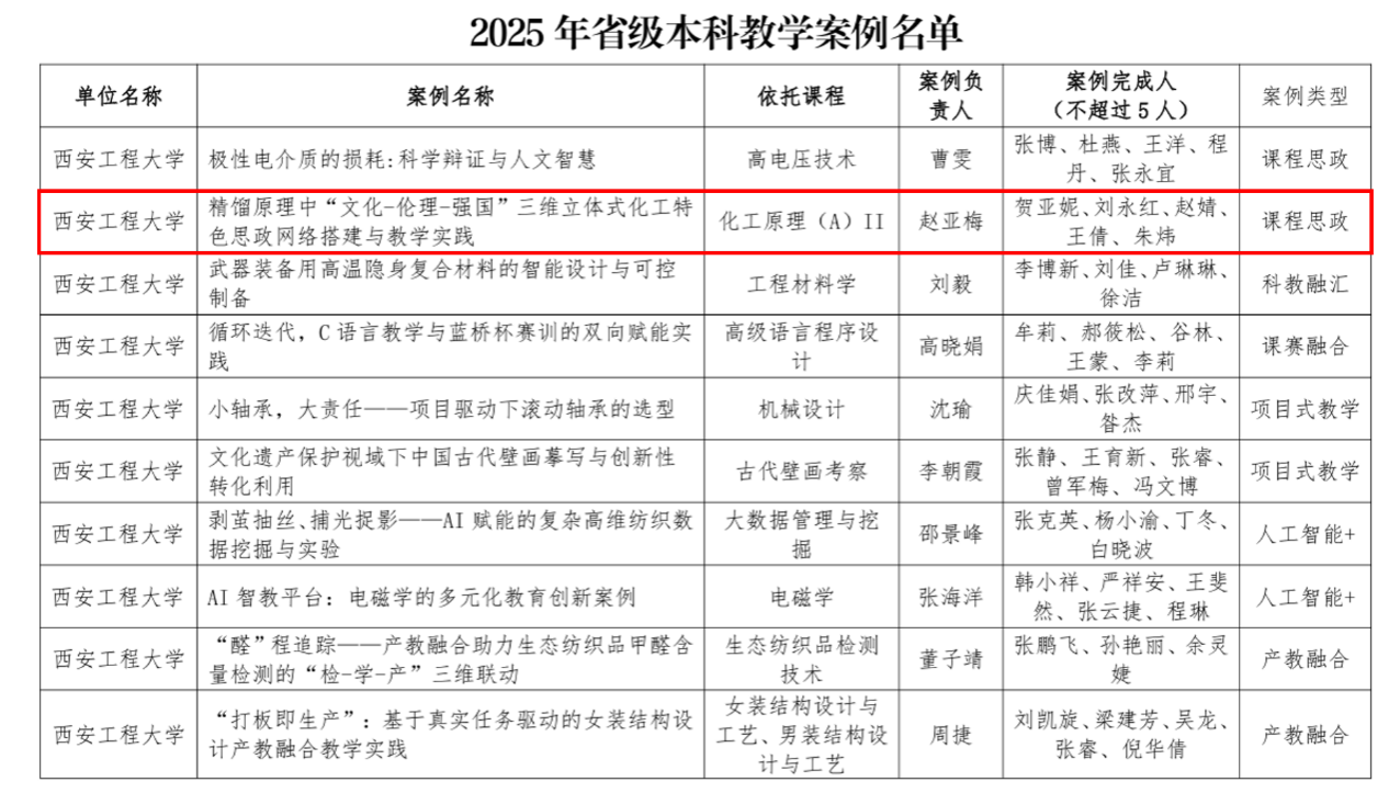 近日,陕西省教育厅公布2025年省级本科教学案例评选结果,色情视频 赵亚梅教授教学团队申报的《精馏原理中“文化-伦理-强国”三维立体式化工特色思政网络搭建与教学实践》案例成功入选,为色情视频 教学改革再添一项省级标志性成果。