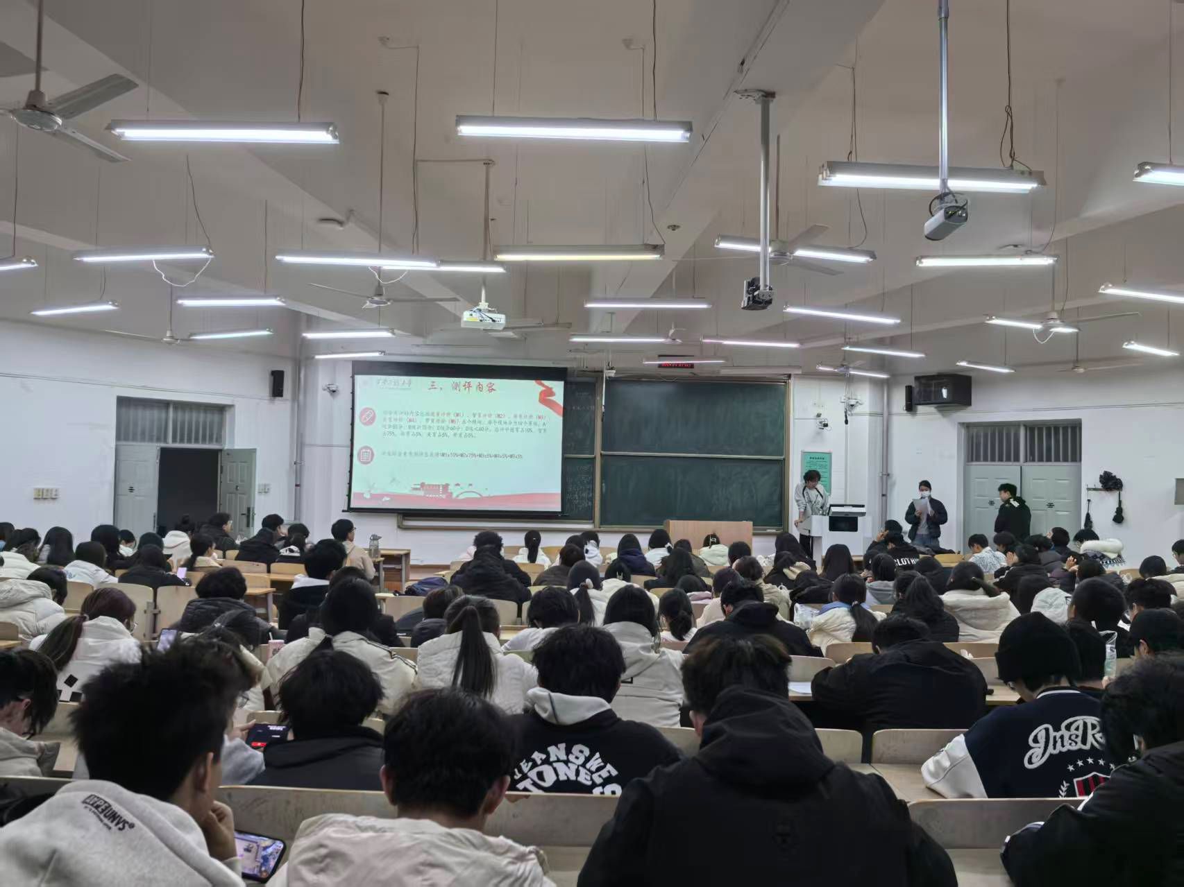 张博首先围绕德育、智育、体育、美育、劳育五大模块,详细说明了考核标准与计分方式。吕国正结合具体案例,生动阐释了各项加减分细则。盖潇宇则针对竞赛级别认定、志愿服务时长计算等常见疑惑进行重点澄清,并特别强调了诚信参评的重要性,引导同学们牢固树立纪律意识。