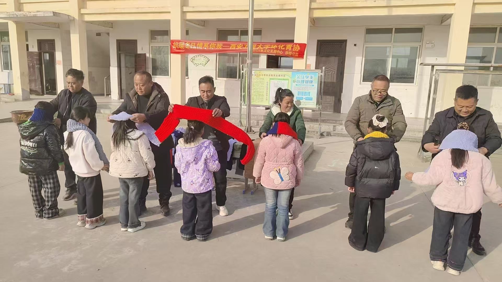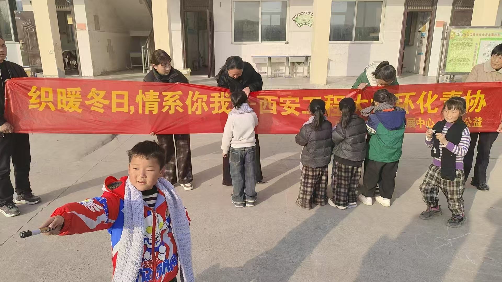 环化青协”的红色横幅,冬日的阳光洒在每个人的笑脸上。当鲜红的围巾被轻轻围上孩子的脖颈,当柔软的毛线帽被戴在头上,操场上响起阵阵欢笑。孩子们戴着新围巾,围成一圈,收到我们的善意,孩子们纯真的笑脸如同绽放的花朵。