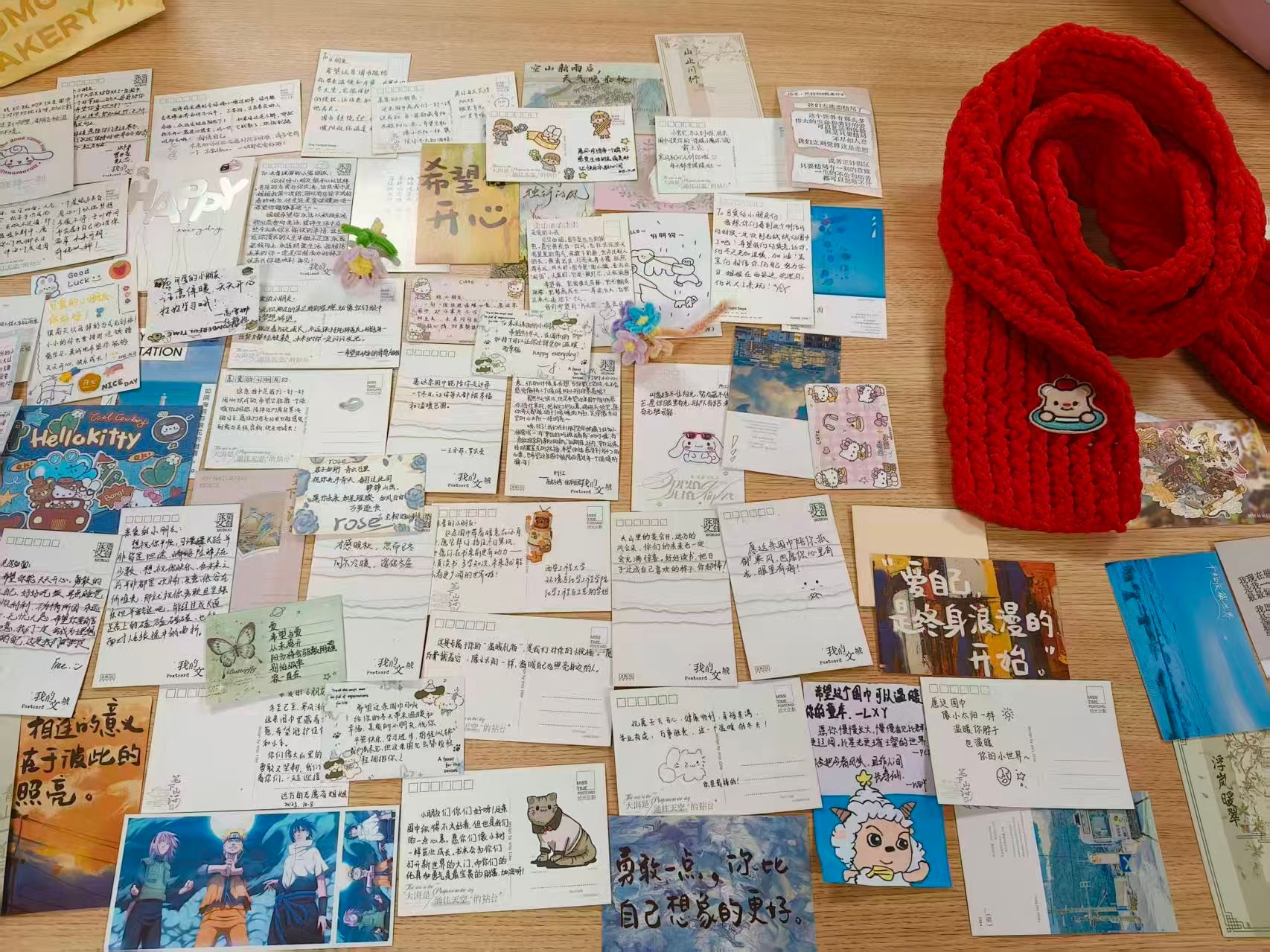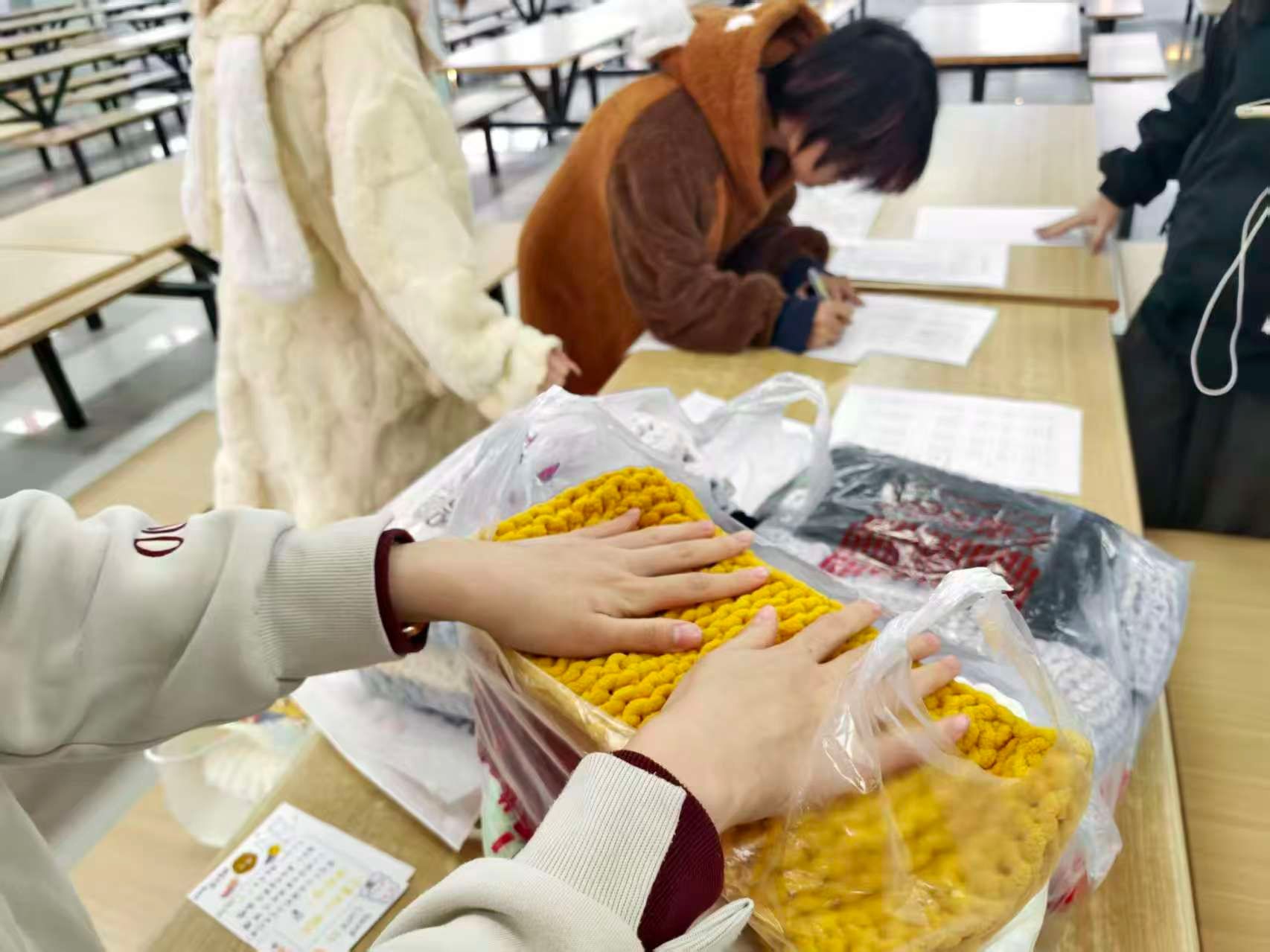 11月15日活动初期,校园食堂中志愿者们领取色情视频提供毛线为远方的孩子们准备“温暖包裹”。他们书写一张张明信片上,手写的祝福语与卡通插画相映成趣:“勇敢一点,你比自己想象的更好”“相逢的意义在于彼此照亮”,字里行间满是温情。