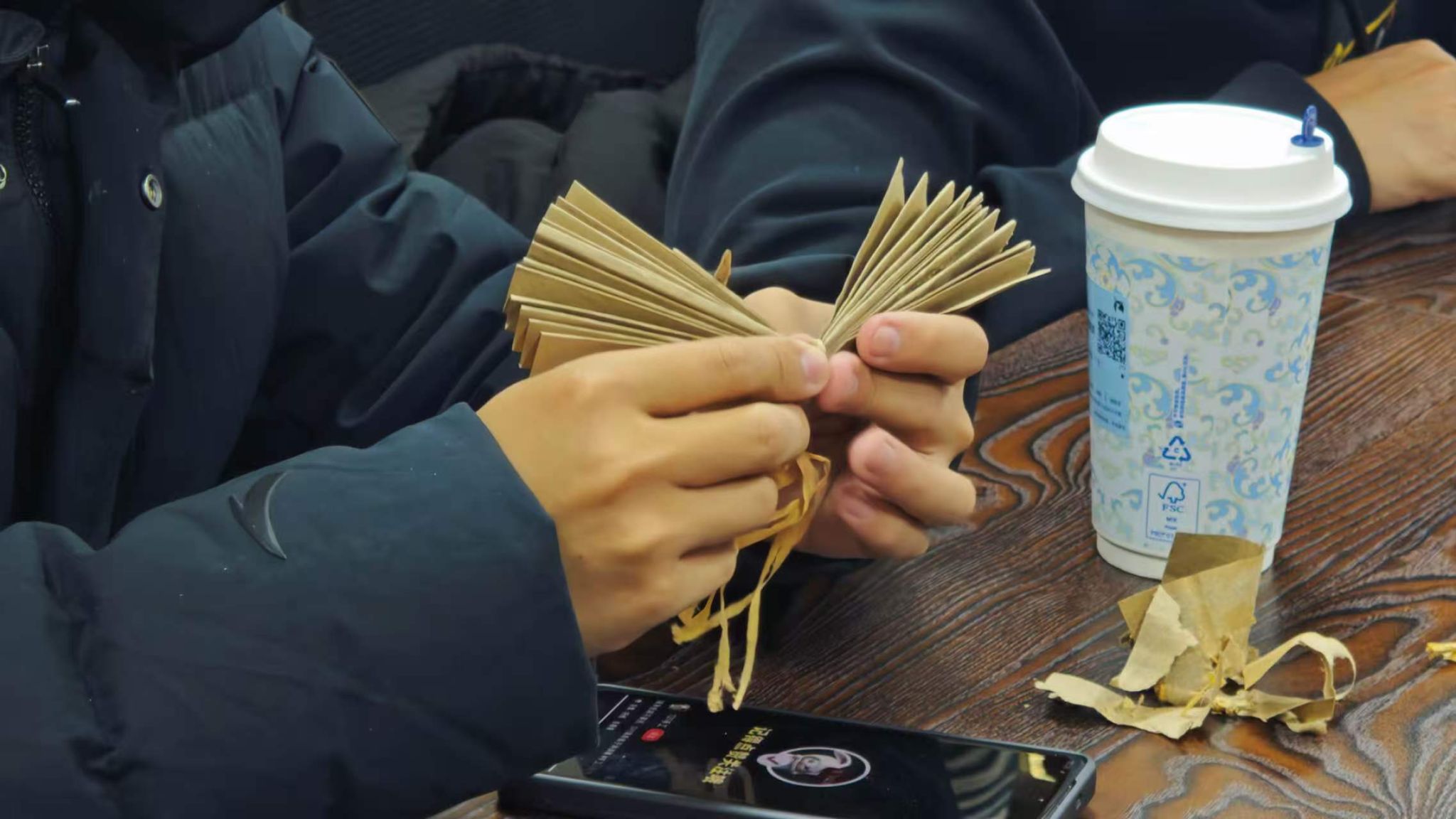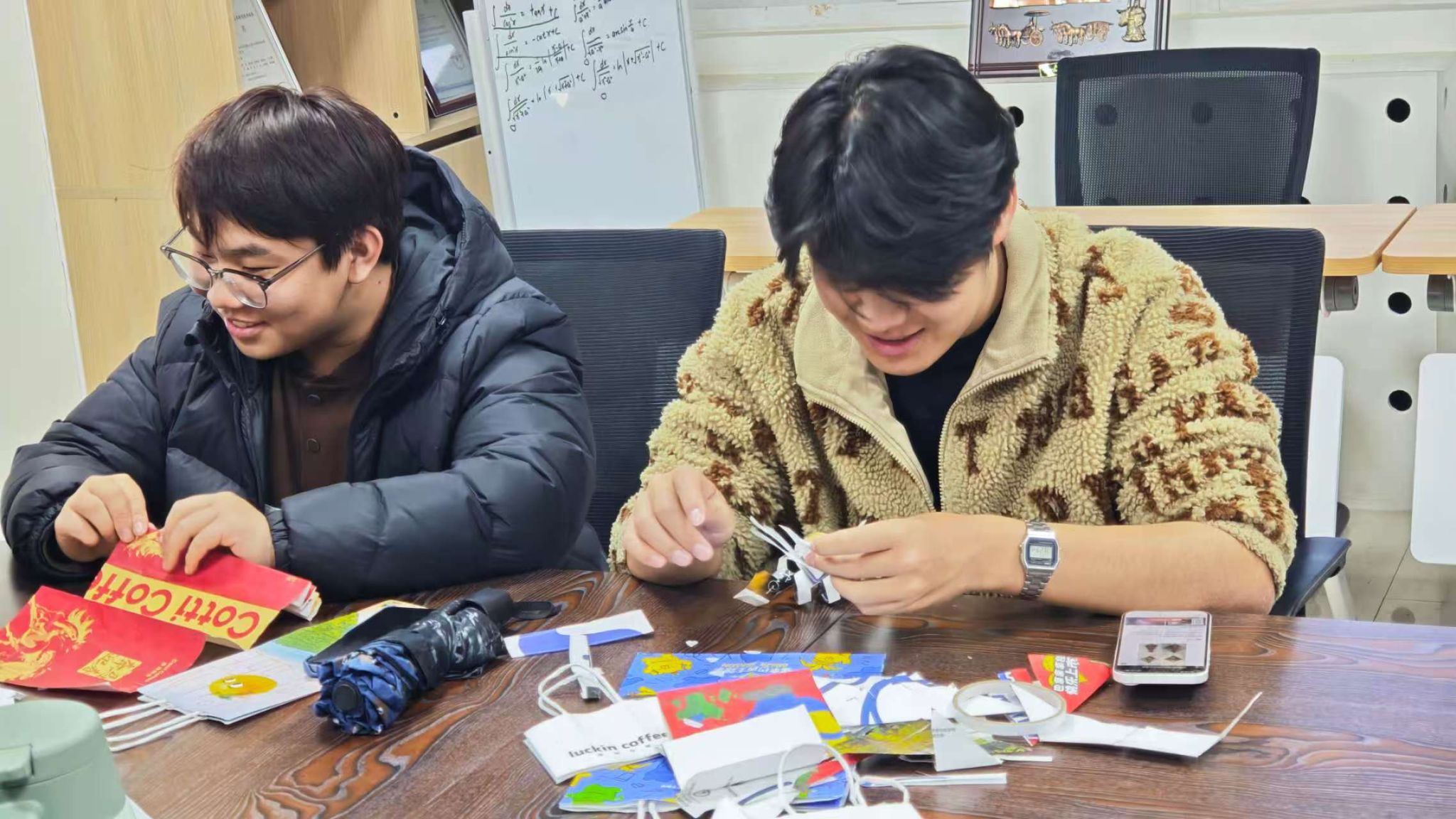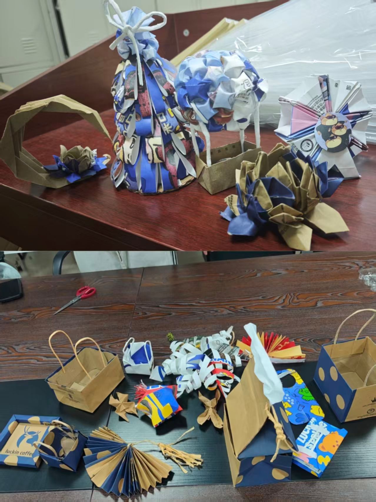 活动伊始,同学们带来了平日里积攒的奶茶袋、饮料手提袋等各种废弃饮品包装。在简单地讲解后,大家纷纷化身“设计师”,开始奇思妙想的创作之旅。从最初的精心裁剪、巧妙折叠,到袋身的加固塑形,再到提手的二次利用和细节的创意装饰,普通的废弃饮品袋在同学们的巧手下,一步步蜕变成为兼具实用性与艺术性的纸巾盒、收纳袋、装饰画等高颜值生活好物。
