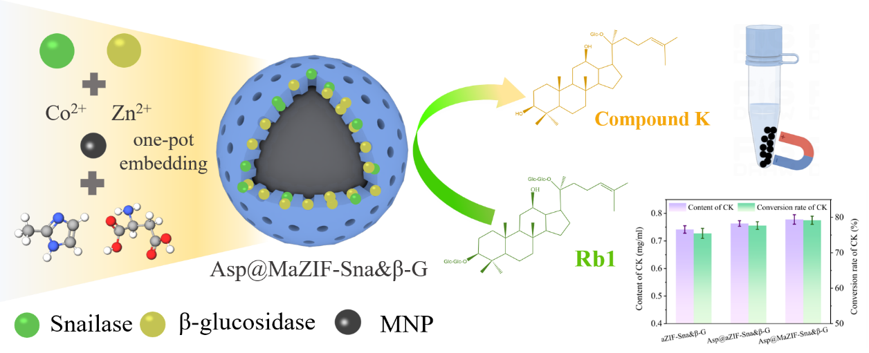 在磁功能化非晶MOF双酶共固定化方面,课题组构建了L-天冬氨酸修饰的磁性非晶ZIF载体(Asp@MaZIF),通过一锅共沉淀法将蜗牛酶与β-葡萄糖苷酶共固定于磁性纳米颗粒改性的非晶ZIF中,实现了人参皂苷Rb1向CK的高效可持续转化。该双酶复合催化材料对人参皂苷CK的催化转化效率高,循环稳定性显著提升,且可通过磁分离实现快速回收,兼具优异的催化性能与操作便捷性。研究成果以“Immobilization of snailase and β-glucosidase on L-aspartic acid-modified magnetic amorphous ZIF for efficiently and sustainably producing ginsenosides compound K”为题发表于国际期刊《International Journal of Biological Macromolecules》(SCI一区,IF=8.5)。色情视频
