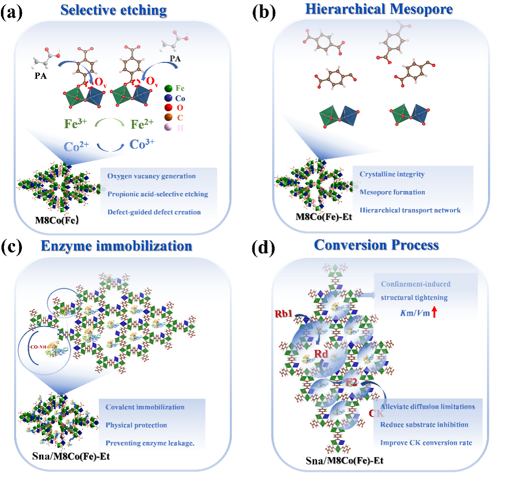 在多级孔MOF酶固定化材料设计方面,课题组提出双金属竞争配位与缺陷工程协同策略,以MIL-88B (Fe)为基底,通过Fe3+/Co2+竞争配位生成氧空位并引导丙酸选择性刻蚀,构建互连多级孔结构,再经碳二亚胺介导共价交联固定蜗牛酶,制备出Sna/M8Co (Fe)-Et复合催化材料,实现了稀有人参皂苷CK的高效酶促合成。该复合催化材料的催化效率较游离酶显著提升,CK转化率高且产物纯度高,循环稳定性优异。研究成果以“Synergistic Bimetallic Competition and Defect Engineering in Hierarchically Porous MOF-Enzyme Composites to Enhance the Enzymatic Synthesis of Rare Ginsenoside CK”为题发表于国际期刊《International Journal of Biological Macromolecules》(SCI一区,IF=8.5)。色情视频