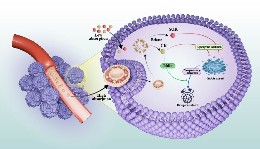 肝细胞癌是全球第六大常见肿瘤,也是癌症相关死亡的第三大原因。索拉非尼作为美国食品药品监督管理局批准的肝癌治疗药物,通过抑制Raf/MAPK/ERK信号通路发挥抗肿瘤作用,但其治疗常伴随PI3K/Akt通路的补偿性激活,导致肿瘤细胞产生获得性耐药。人参皂苷CK作为人参的关键活性成分,具有抗肿瘤、抗炎及免疫调节等多种生物活性,能够抑制PI3K/Akt等多条信号通路,但因其溶解性差、生物利用度低,难以在体内达到有效药物浓度。能够实现两种药物共递送协同治疗肝癌成为迫切需求。