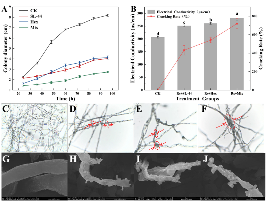 何艳慧副教授指导学生,针对以上难题,创新性地提出了生防菌与化学农药联合应用策略。实验结果表明,枯草芽孢杆菌SL-44和己唑醇联合应用时,生防菌SL-44的活性产物可以破坏真菌的细胞壁,而己唑醇主要通过抑制细胞膜形成,破坏细胞膜完整性,联合用药的“双重打击”导致菌丝结构、基质流失及线粒体功能障碍,从而高效抑制病原菌的生长与侵染。