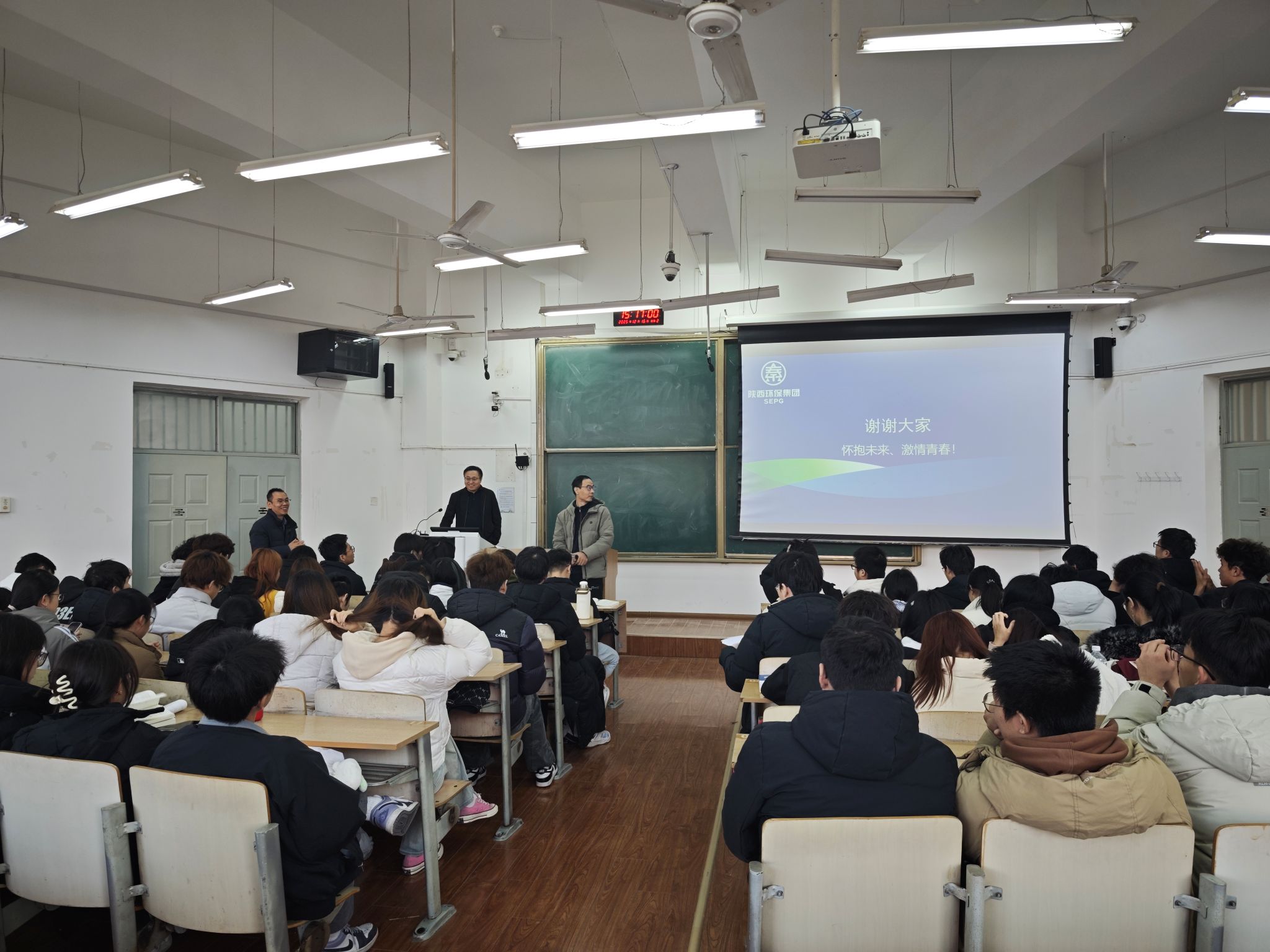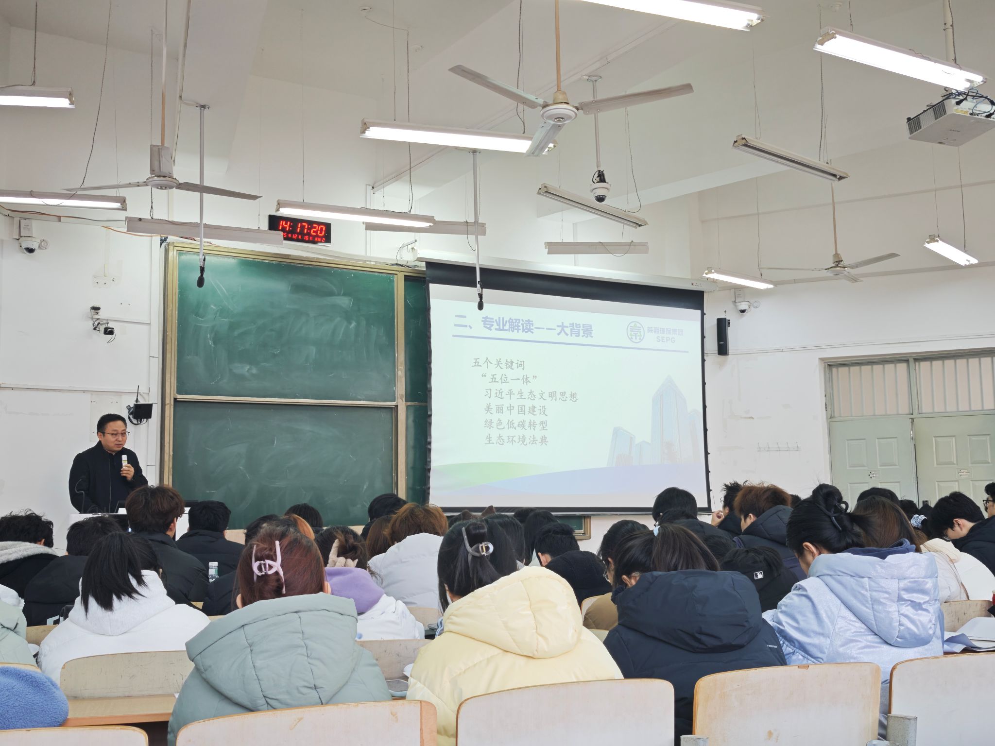 报告中,郭治敏校友以“谈谈人生”“专业解读”“一点建议”为主线,结合个人成长经历与行业洞察展开分享。在“谈谈人生”部分,他勉励学子树立远大理想、保持奋斗热情,以坚定步伐迈向人生目标。“专业解读”环节,郭治敏立足国家政策与行业趋势,系统剖析环境工程专业的发展前景,将环保领域归纳为污染治理、环境质量改善与协同效益三大类别,并指出行业正迈向AI赋能、运维深化与科技集约的新阶段,为同学们勾勒出清晰的专业发展图谱。在“一点建议”中,他强调青年学子应珍惜时光、夯实专业、勇于尝试,在探索中积累经验,在实践中持续成长。