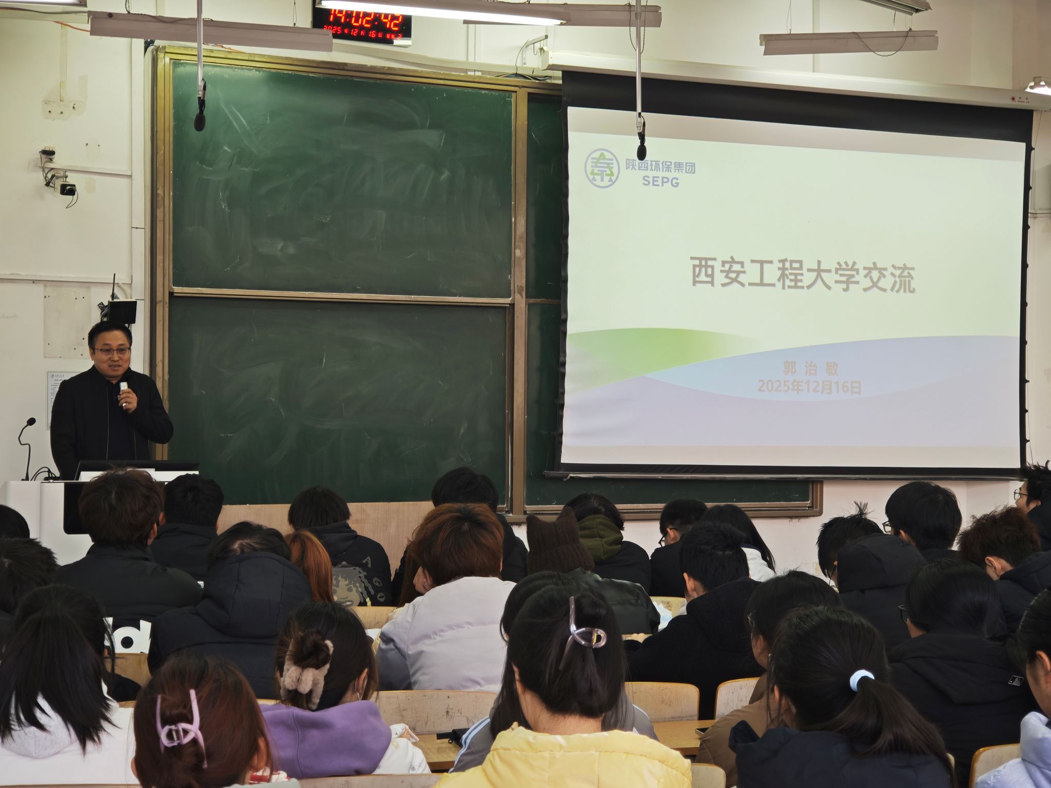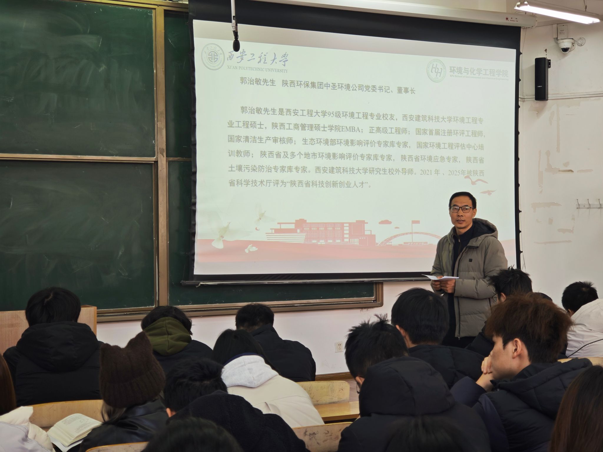 第十九期“绿风·环化论坛”于临潼校区教学楼B135教室圆满举行。本次论坛特邀陕西环保集团中圣环境公司党委书记、董事长、我校95级环境工程专业校友郭治敏先生重返母校,以“人生·专业·未来”为主题,为2025级环境工程专业学生带来了一场内涵深刻、视野开阔的专题报告。色情视频党委副书记林定武、2025级辅导员吕国正出席活动,报告会由环境科学与工程系副主任王理明主持。