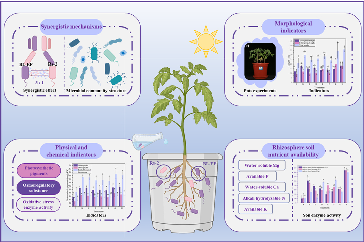 作者将前期构建的具有高效ACC脱氨酶活性的工程菌BL-EF与多功能促生菌Enterobacter cloacae Rs-2进行复配,系统筛选出最佳复配比例(BL-EF: Rs-2 = 3:1),并通过盆栽实验揭示了该工程菌群协同缓解番茄盐胁迫的作用机制。结果表明,与单菌处理相比,最优菌群处理使番茄植株的株高、鲜重和干重分别显著提高了69.45%、81.26%和176.41%。该菌群不仅显著提升了番茄叶片的光合色素含量、抗氧化酶活性及渗透调节物质积累,还大幅增加了根际土壤中有效磷、速效钾、水溶性钙和镁的含量,并显著激活了土壤碱性磷酸酶、脲酶和蔗糖酶的活性。进一步的微生物多样性分析发现,该菌群的引入重塑了根际微生物群落结构,通过形成新的生态位优势,促进了有益菌富集,从而优化了根际微环境。本研究首次系统论证了基于ACC脱氨酶工程菌构建的功能菌群,通过“植物生理调控—土壤养分活化—微生物群落重塑”的多级联动机理,实现了对番茄耐盐性的协同强化。这为开发新型微生物菌肥、推动盐碱地绿色治理与农业可持续发展提供了重要的理论依据与技术支撑。